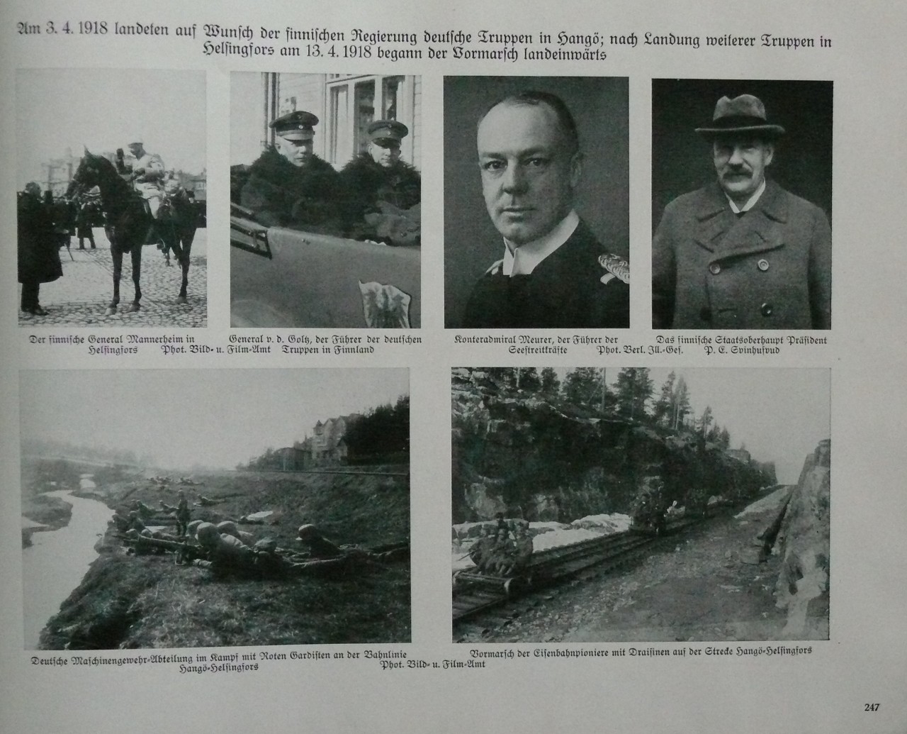 Ensimmäisen rivin kuvien alla: Suomalainen kenraali Mannerheim Helsingissä - Kenraali von der Goltz, saksalaisten joukkojen johtaja Suomessa - Merivoimien johtaja kontra-amiraali Meurer - Suomen valtionpäämies Presidentti P.E. Svinhufvud