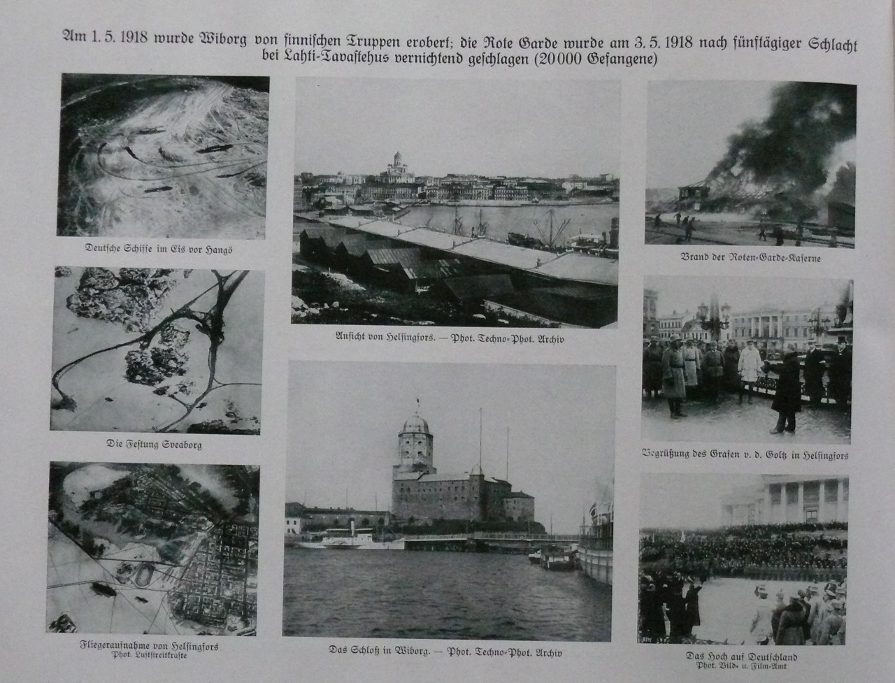 Ensimmäisen rivin kuvien alla: Saksalaisia aluksia jäissä Hangon edustalla - Näkymä Helsinkiin (keskellä ylinnä) - Punakaartin kasarmin palo