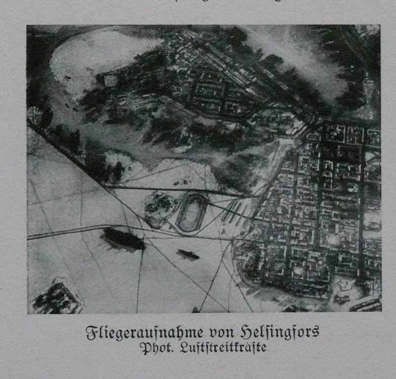 Kolmannen rivin kuvien alla: Ilmakuva Helsingistä (suurempana) - Viipurin linna - Eläköönhuuto Saksalle