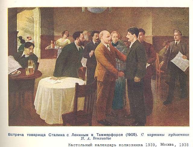 Neuvostoliitossa aikanaan laajalti levitetty tait. I.A. Venhvadzen laatima kuva Leninin ja Stalinin ensimmäisestä tapaamisesta Tampereella bolshevikkien salaisessa kokouksessa joulukuussa 1905.