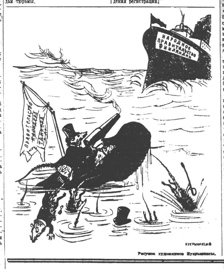 Pravdan piirtäjäryhmä Kukrynitsyn näkemys voittoisasta Kuusisen hallituksesta (laivan keulassa: Suomen Kansanhallitus). Suomen hallitusta kuvaavan veneen lipusta on vedetty yli sanat "Cajanderin" ja "Tannerin".