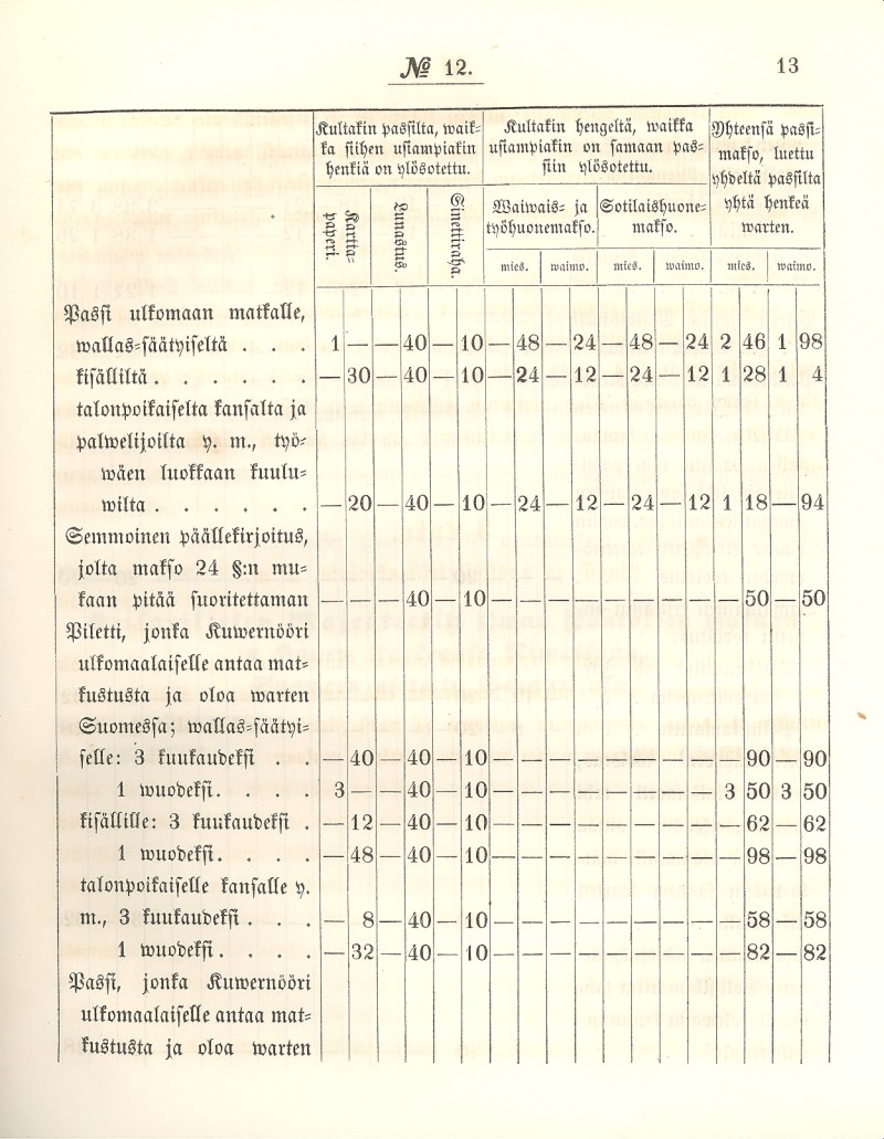 Kullenki ulkomaalle matkustawalle hengelle pitää annettaman eri passi, paitsi miehelle ja waimolle, wanhemmille ja lapsille, isännälle tahi emännälle palwelijoinensa sekä kaikille yhteen perhekuntaan kuuluwille hengille, joille yhteinen passi, jos sitä tahtowat, annettakoon.