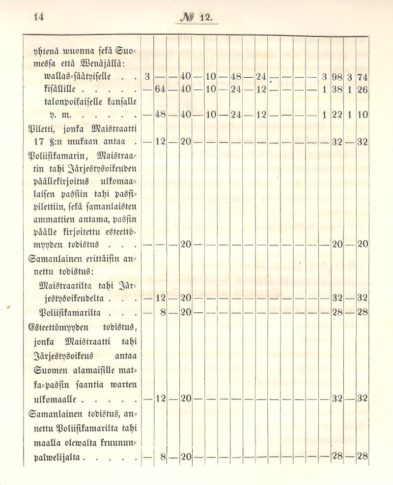 Muu sekä siwiili että kirkollinen wirka- tahi palwelusmies, joka passia tämmöiselle matkalle tahtoo, näyttäköön, sitä saadaksensa, että asianomainen wirkawapaus hänelle on myönnytetty. Upseeri tahi Suomen sotawäkeen kuuluwa wirkamies osoittakoon semmoisessa tapauksessa, että hänellä on wirkalupa ulkomaalle matkustaa.