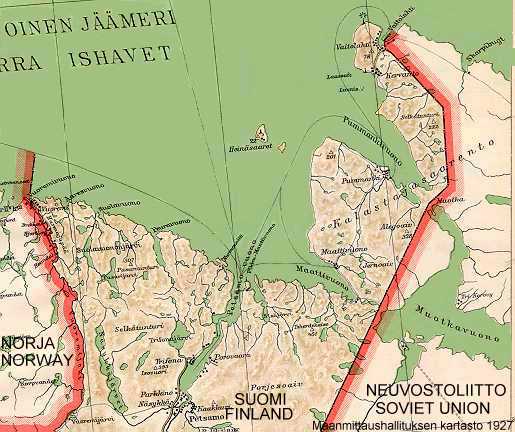 Jäämeren ranta ja Kalastajasaarento. Moskovan rauhassa 1940 Suomi menetti Kalastajasaarennon ja vuoden 1944 rauhassa koko Petsamon ja näin yhteyden valtamerelle.