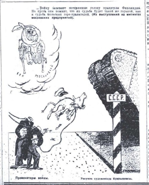 Pravdan piirtäjäryhmä Kukrynitsyn näkemys väitetyistä Mainilan laukauksista. Pilapiirros ennustaa päänsä menettäneille Suomen johtajille samaa kohtaloa kuin heidän puolalaisille kollegoilleen. (Puolan presidentti Beck ja ulkoministeri Moscicki nojailevat pilvessä kaunalosauvoihin.) Päättömien suomalaisten alla teksti "sotaprovokaattorit".