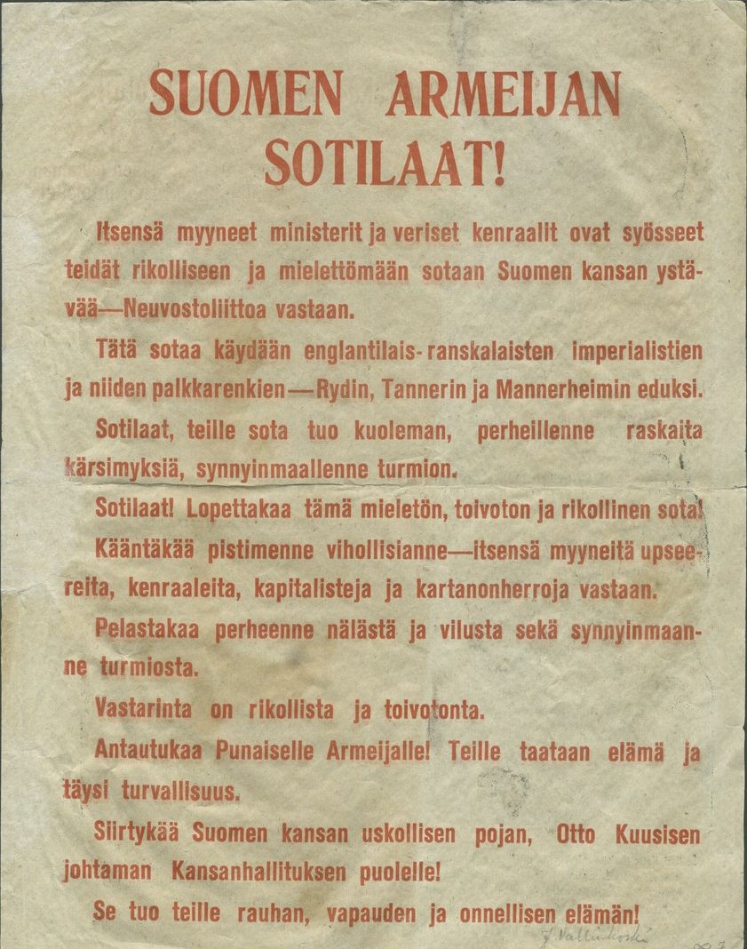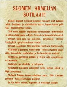 täysin epäuskottavia lentolehtisiä. "Suomen kansan uskollinen poika" Otto-Ville Kuusinen kehottaa "englantilais-ranskalaisten imperialistien etujen" puolesta taistelevia suomalaisia antautumaan. Kansalliskirjaston aineisto Doria-tietokannassa) |