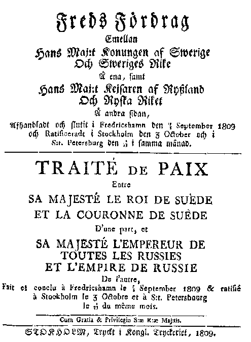Nous ALEXANDRE I. par la grace de Dieu, Empereur et Autocrateur de toutes les Russies, de Moscovie, Kiowie, Wladimi-rie, Novogorod, Czar de Casan, Czar d'Astracan, Czar de Sibérie, Czar de la Chersonèse Taurique, Seigneur de Plescou et Grand-Duc de Smolensko, de Lithuanie, Volhynie, Podolie et de Finlande, Duc d'Estonie, de Livonie, de Courlande et Semigalle, de Samogitie, Bialostock, Carélie, Twer, Jugorie, Permie, Wiatka, Bolgarie et d'autres; Seigneur et Grand-Duc de Novogorod inférieur, de Czernigovie, Resan, Polozk, Rostow, Jaroslaw, Belo-Osérie, Udorie, Obdorie, Condinie, Witepsk, Mstislaw, Dominateur de tout le côté du Nord, Seigneur d'Iverie, de la Cartalinie, de la Géorgie et de la Cabardie, Prince Héréditaire et Souverain des Princes de Czercassie, Gorsky et autres, Successeur de Norvège, Duc de Schleswick-Hollstein, de Stormarie, de Ditmarsen et d'Oldenbourg &c. &c. &c.: Savoir faisons par ces presentes que d'un commun accord entré Nous et Sa Majesté le Roi de Suède, Nos Plénipotentaires respectifs ont, en vertu de leurs plein-pouvoirs, arrêté et signé à Fredrichshamn le 5 (17) Septembre de la présente année, un Traité de paix, dont la teneur mot pour mot est comme suit: