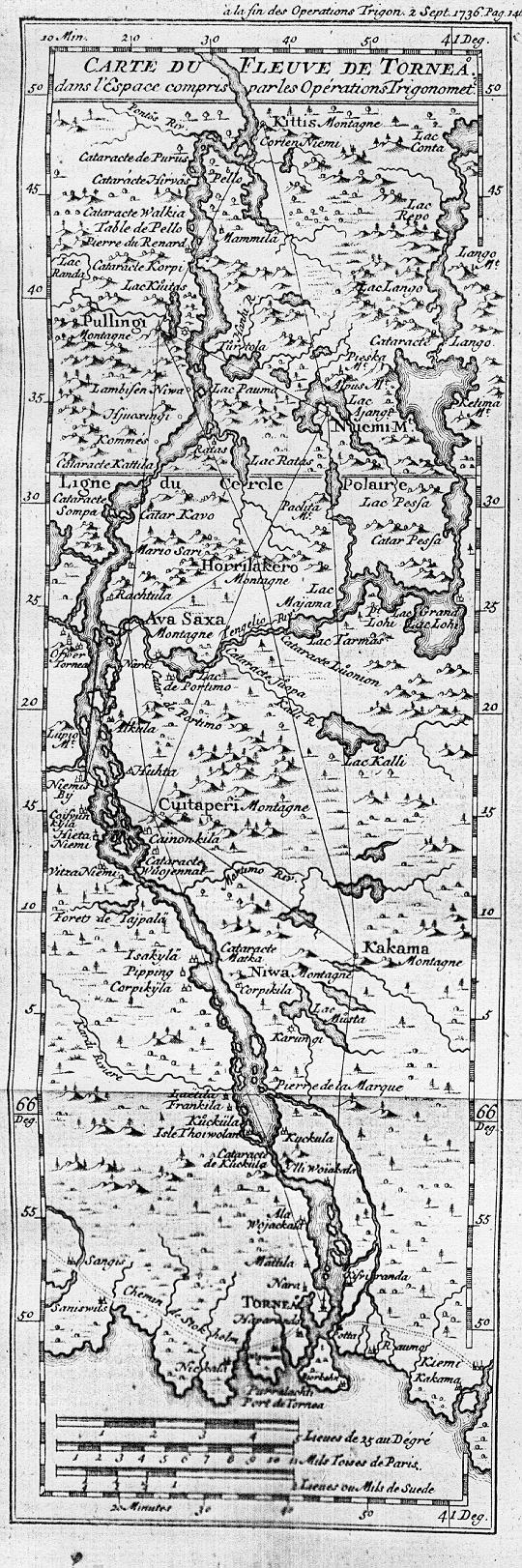The results of the measurements were made public in Maupertuis's book "La Figure de la Terre" (Paris 1738). It was also published in English as "THE Figure of the Earth" (London 1738) and in Latin, Leipzig 1742. The academy correspondent, abbot Réginald Outhier published in 1744 in Paris an illustrated account of the journey "JOURNAL D'UN VOYAUGE AU NORD, En 1736. & 1737". Outhier's map (337 K)