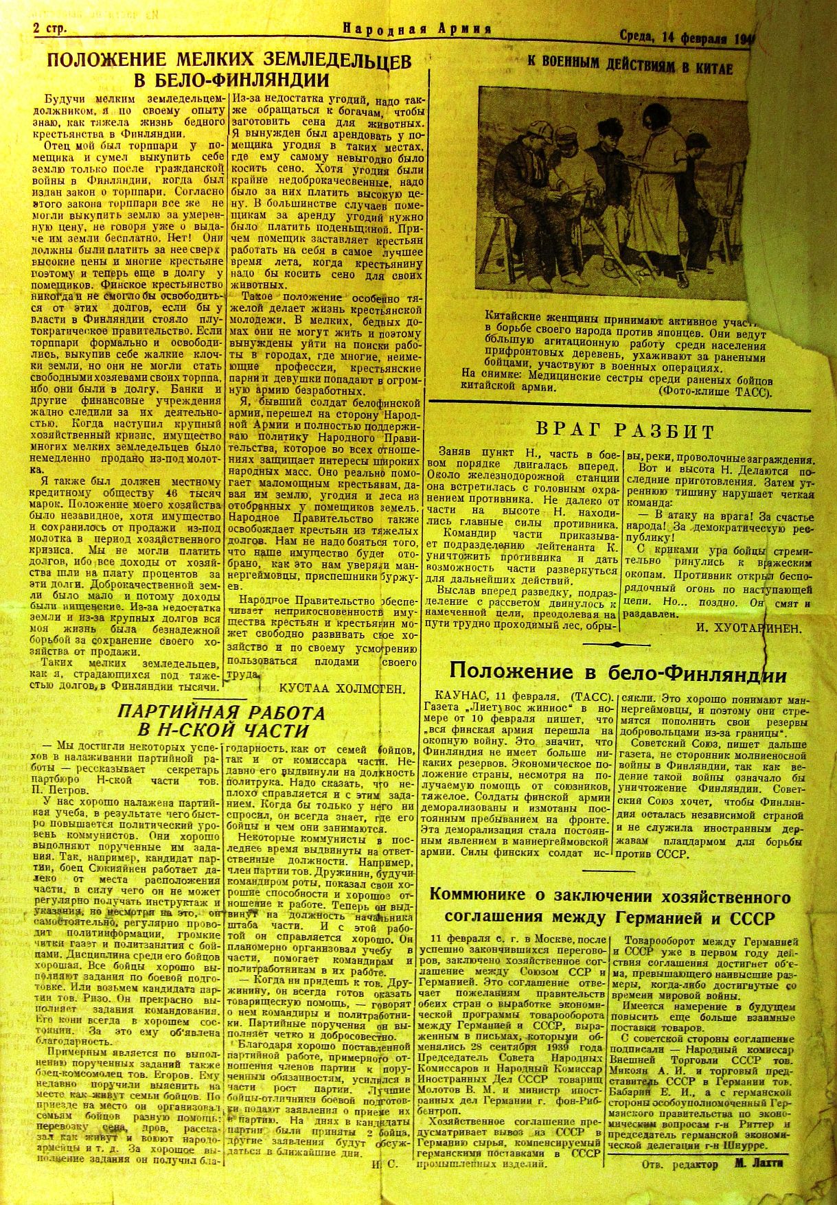 of the People, i.e. of Finland). The "Army" was created as a flank of the Red Army to liberate Finland from the yoke of her bourgeois government. Issue of Feb. 14, 1940. Two pages in Russian (front page, page 2). Translation of the communiqué about the new Soviet economic treaty with the National Socialist Germany published in the newspaper's page 2.