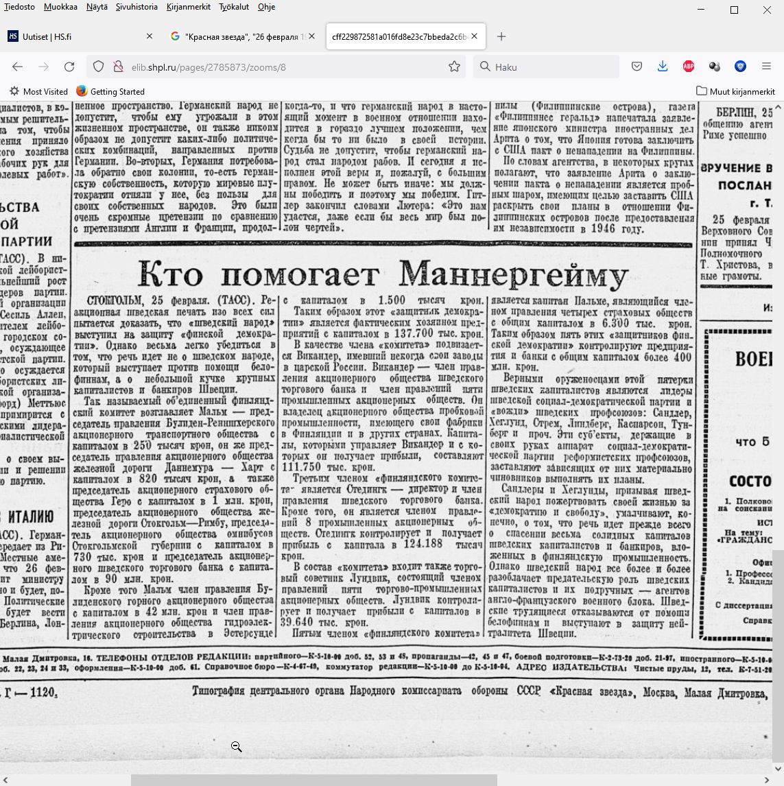 The article about the Swedish aid to Finland in Krasnaya Zvezda, the Central Organ of the People's Commissariat for Defence of the USSR on 26th of February, 1940. Translations (original, Finnish p.3, English p.5)