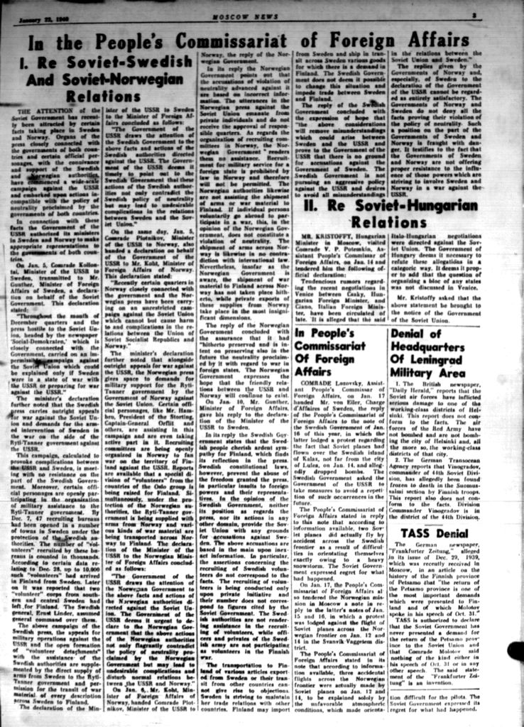 Three "minor" news in the English language Moscow newspaper Moscow News, January 22, 1940: Regrets for accidentally flying over Sweden and Norway; Helsinki was never and will never be bombed by Soviet Air Forces; dismissing false German news about the intentions of Soviet Government on Petsamo. The full page