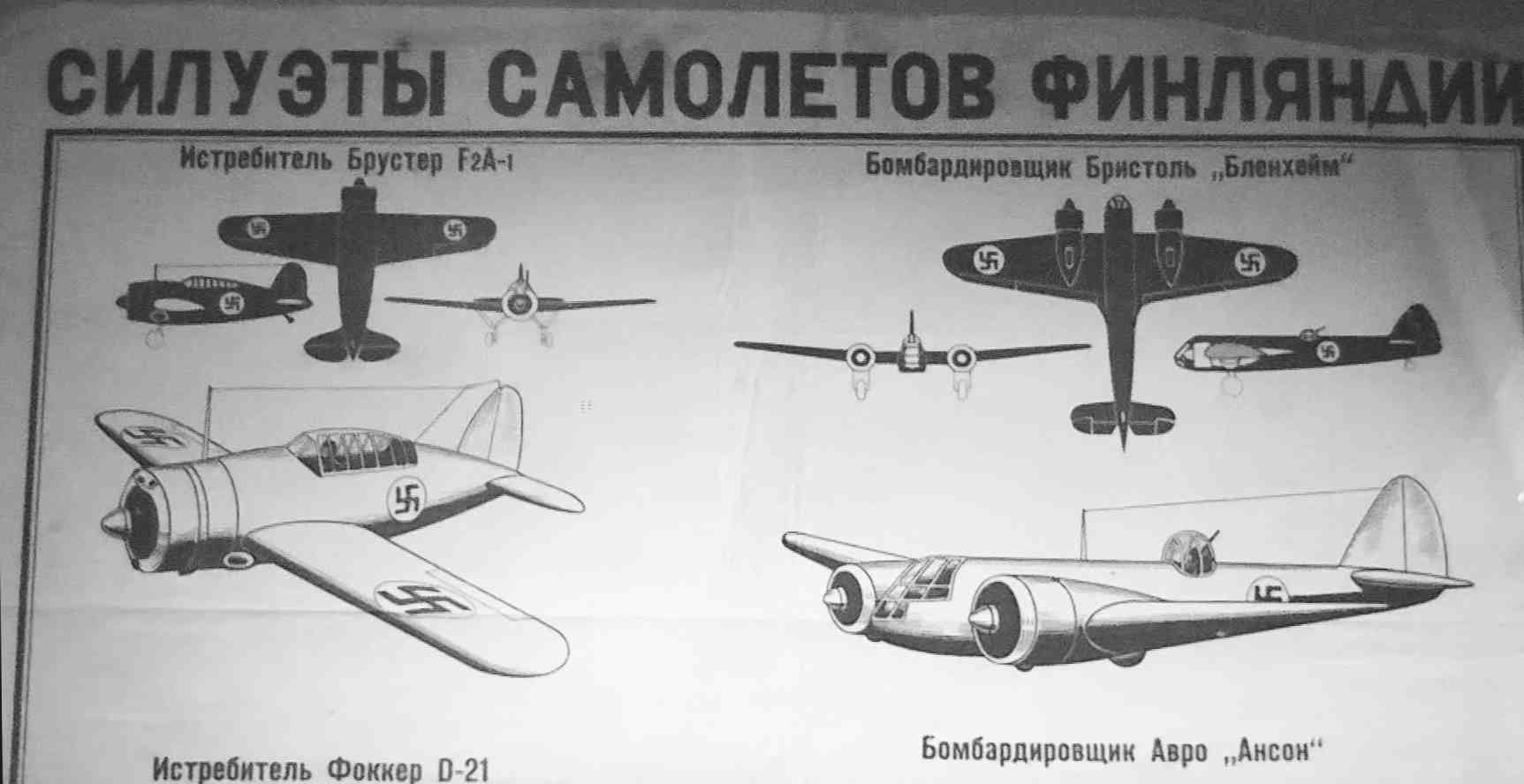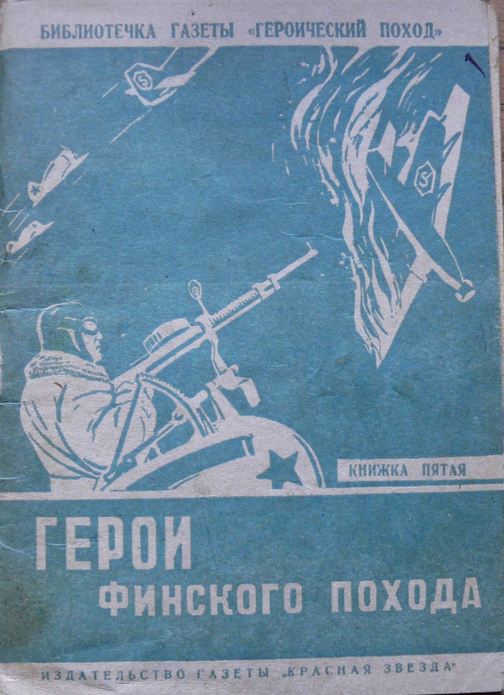 airplanes misleadingly marked with Civic Guard sleeve badges. The actual insignia, swastika, used since 1918 in Finnish military airplanes, could not be used because it had easily been confused with that of Germany, then the contractual partner of the Soviet Union. Cover page of the book: "Heroes of the Finnish campaign". The Krasnaja Zvezda Publishing House, Moscow, 1940. Drawn by Dolgorukov. |
