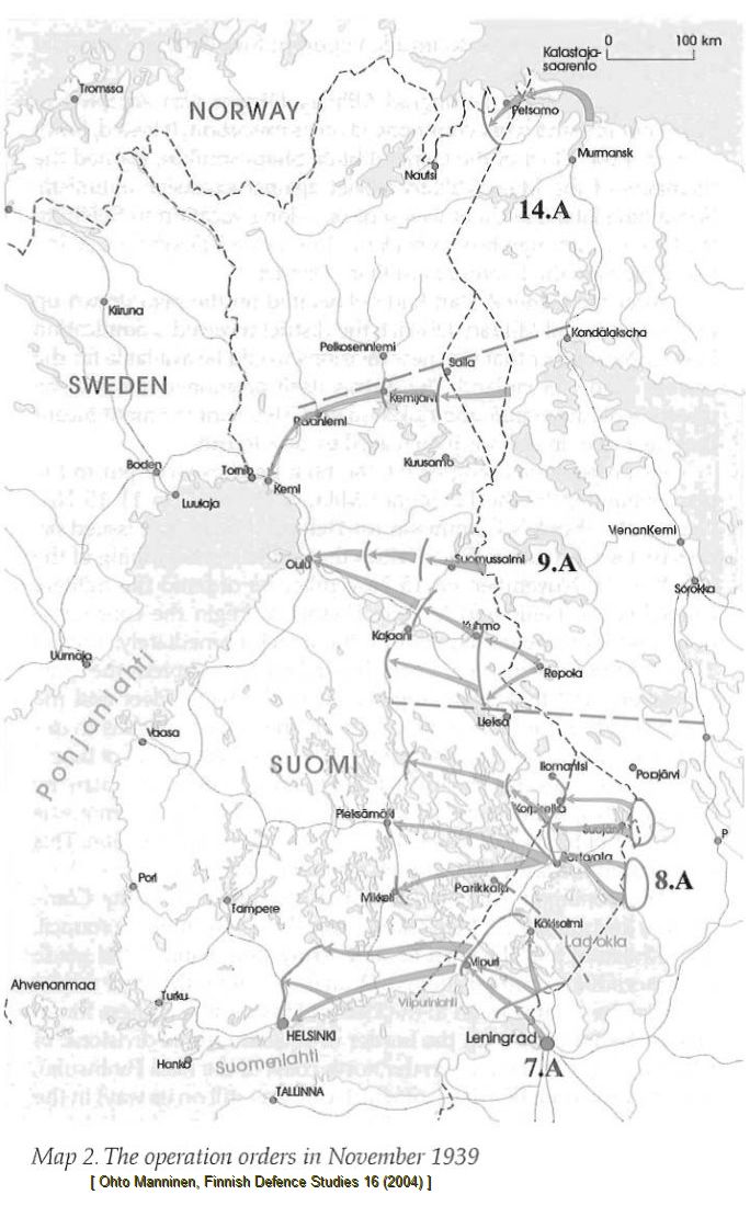 The report of the commander of the Leningrad military district to the People's Commissar for defence about the plan to defeat Finnish land and sea forces, Nr. 4587 - At the end the deployment areas of troops for the invasion to Finland (Murmansk, Reboly/Repola, Vidlitsa/Vitele, Karelian isthmus, Red-Flag Baltic Navy, front troops = Leningrad HQ); battalions (141 in total), light artillery (958), heavy artillery (592), tanks (740+249), airplanes (1581). - Distribution: 2. cl. Army Commander Meretskov, member of the war council Army Corps commander Vashugin, military district chief of staff Brig. Commander Tshibisov, Operations Chief of Staff of the Leningrad mil. dist. Colonel Tikhomirov. Map describing the planned invasion (Manninen 2004) |