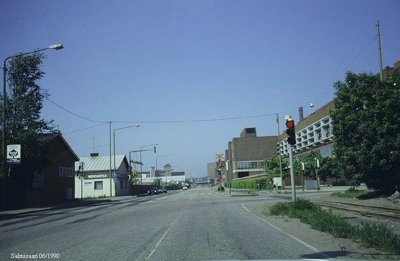 1990 Salmisaari, Itämerenkatua Lauttasaareen päin kesäkuussa. Liikennevalon kohdalla Länsiväylän liittymä