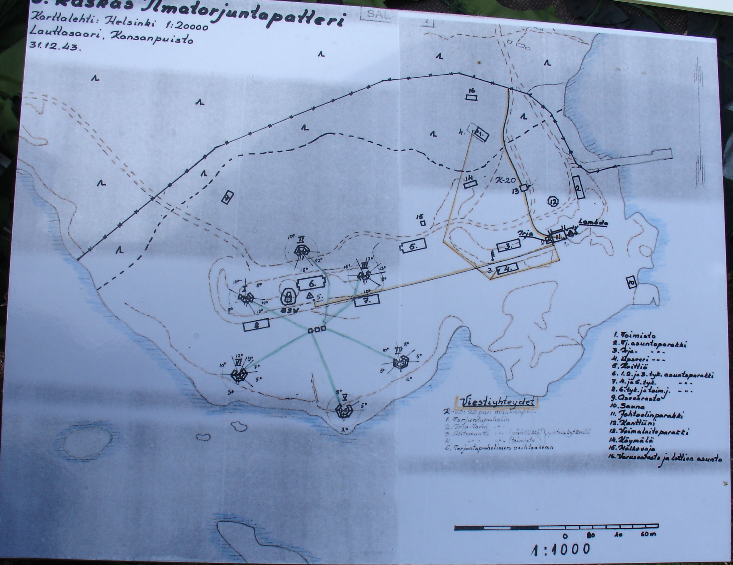 In Lauttasaari, two antiaircraft guns (picture on the left) were erected on the island at the sites of "Puisto" and "Lautta" heavy gun batteries as local commemorations of those times. The "Puisto" battery in the south also had one of the four "Irja" radars in Helsinki. The situation chart of the air defence battery in the SE tip of Lauttasaari. The radar position marked as "Irja".