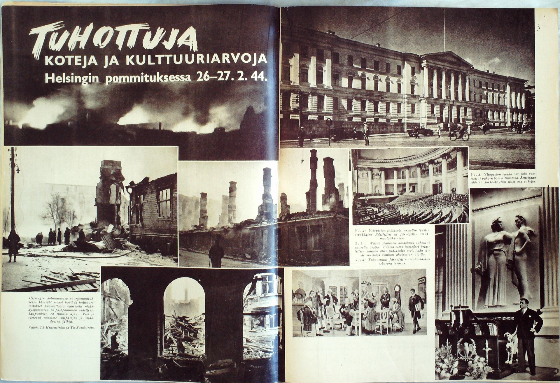 The university main building at Senate Square was hit by bombs during the third February bombing wave of the Soviet air forces on Feb. 26-27, 1944. The building, planned by architect C.L. Engel and built in 1832, was restored in 1944-1948. (The Magazine "Hakkapeliitta", nr. 10, March 7, 1944)