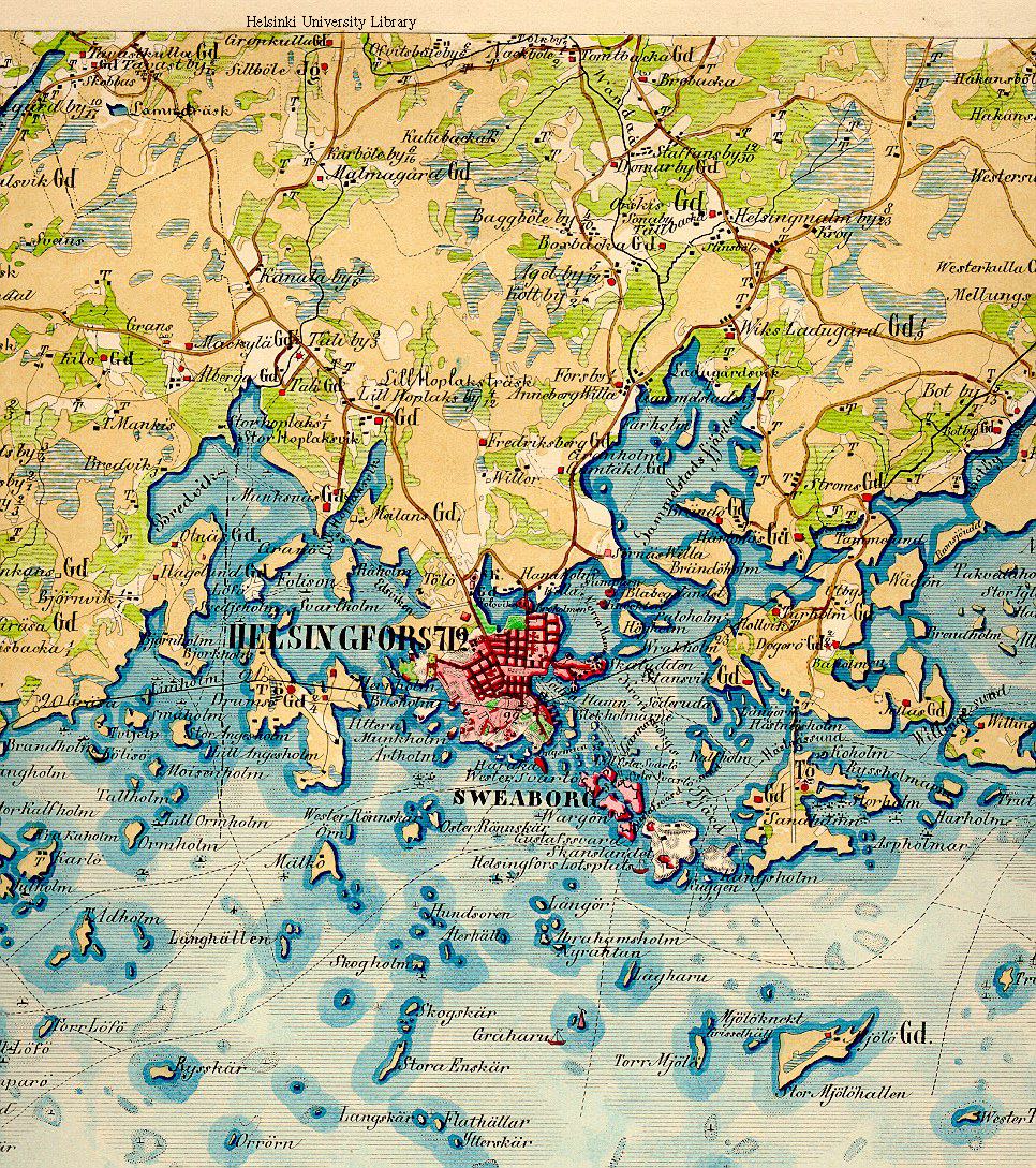 1885 The southern part of the island facing the relatively open sea was declared a military zone by Russian authorities. Extensive fortification (images) work started. Even earlier, in 1863, minor improvements were made in the lines constructed 1853-55. The Sveaborg fortifications esplanade covered a large area around the citadel and nearby islands, incl. Drumsö (later Lauttasaari). (Helsinki City Archives.) ![]() |