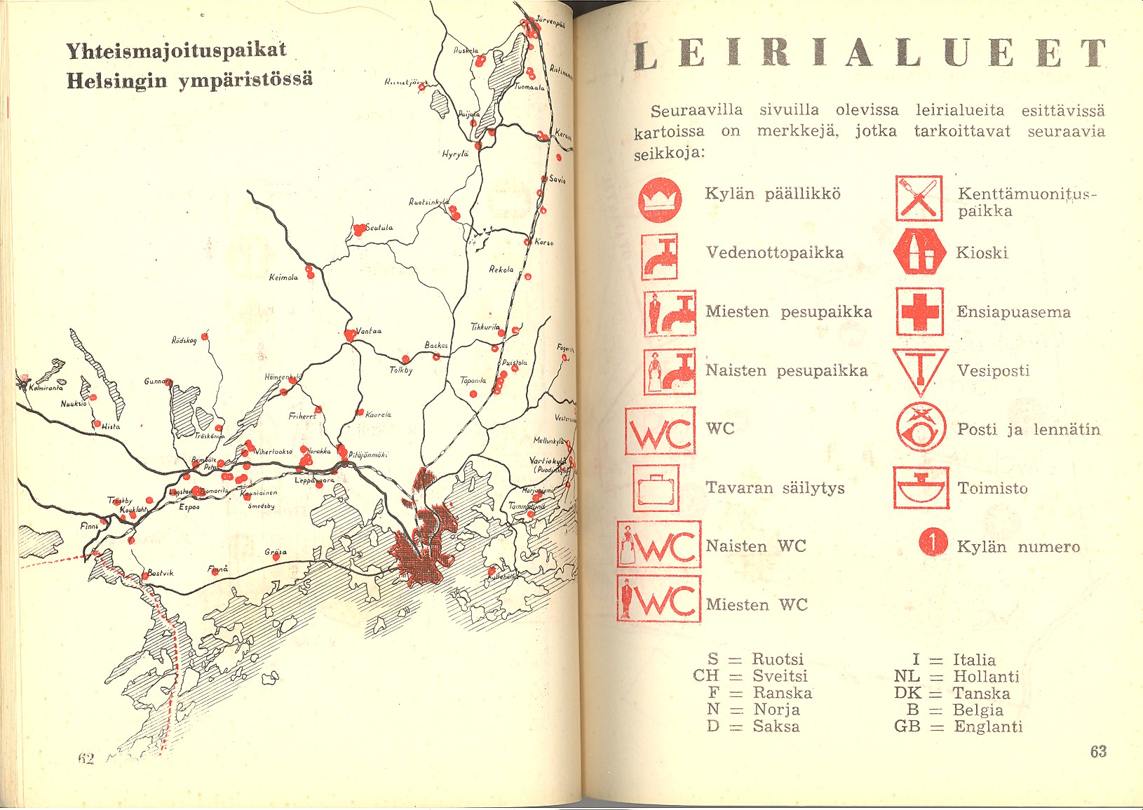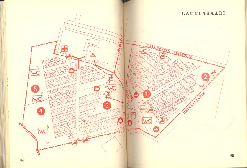 1952 Lauttasaari still with large free areas offered open air accommodation for Helsinki 1952 Olympic guests. Two pages from the Games guide book: the camping area, other camping sites (Leirialueet) near Helsinki & map legend