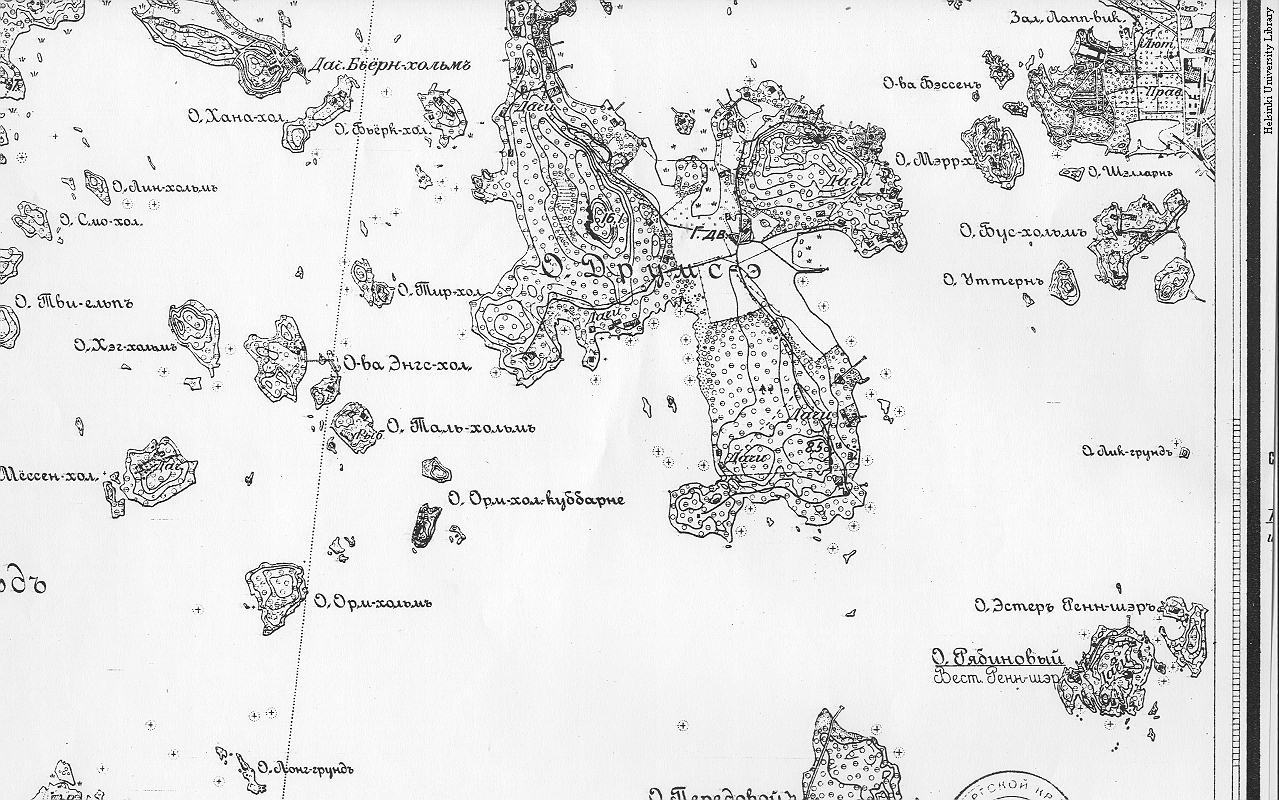 Lauttasaari (О.Друмс-э) in a Russian military topographical map of 1893. The map, with other topics, are presented on the pages of the National Archives of Finland. Russian military documents form a separate collection of 18,000 documents occupying 338 meters of shelf space. In addition to this, the National Board of Antiques has 7,500 maps and drawings in their archives. All this material was left in the country when Russian troops withdrew from Finland in 1917-1918. |